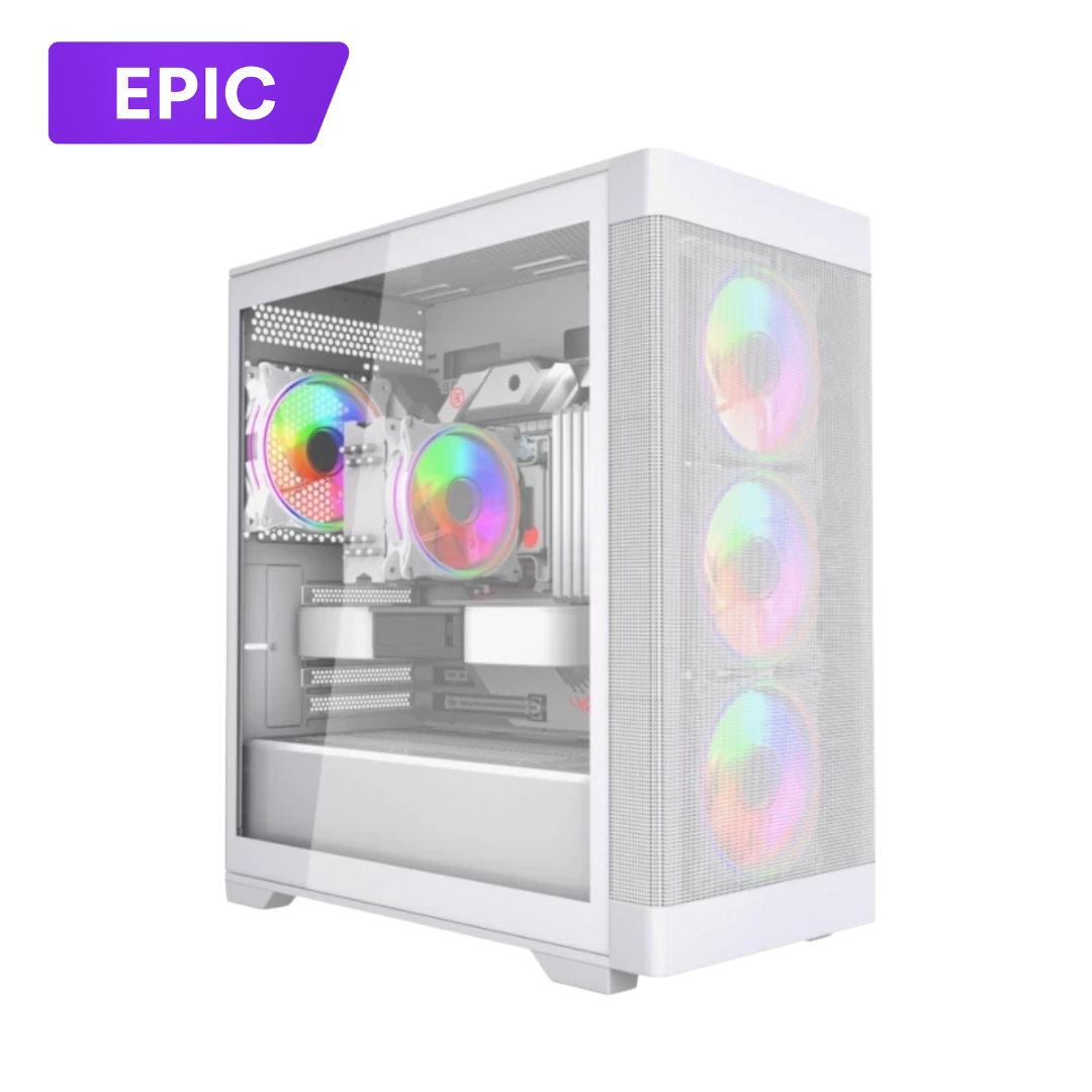 A clean, modern all-white build that doesn’t just look stunning – it performs. Powered by the Ryzen 5 8400F and Nvidia’s RTX 5060 8GB, this rig delivers high-FPS gaming at 1080p ultra and smooth performance at 1440p.